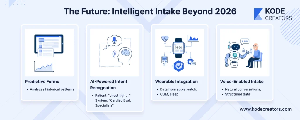 Voice-enabled intake serves aging populations and accessibility needs while reducing form fatigue. Patients have natural conversations with AI assistants that extract structured data from unstructured dialogue. By 2027, we'll see intake systems that know patients better than they know themselves, predicting problems before symptoms appear.