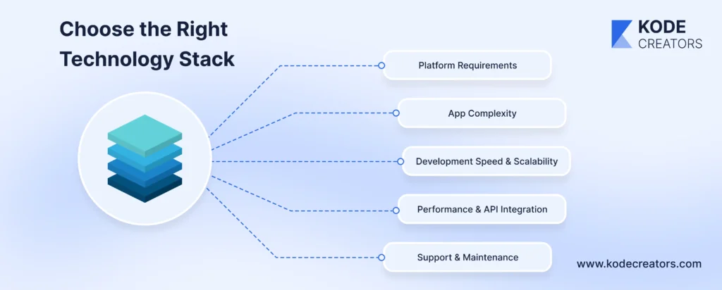 The technology stack you choose directly impacts your app’s performance, scalability, and maintenance. A carefully selected stack ensures that your app is efficient today and adaptable for future growth.