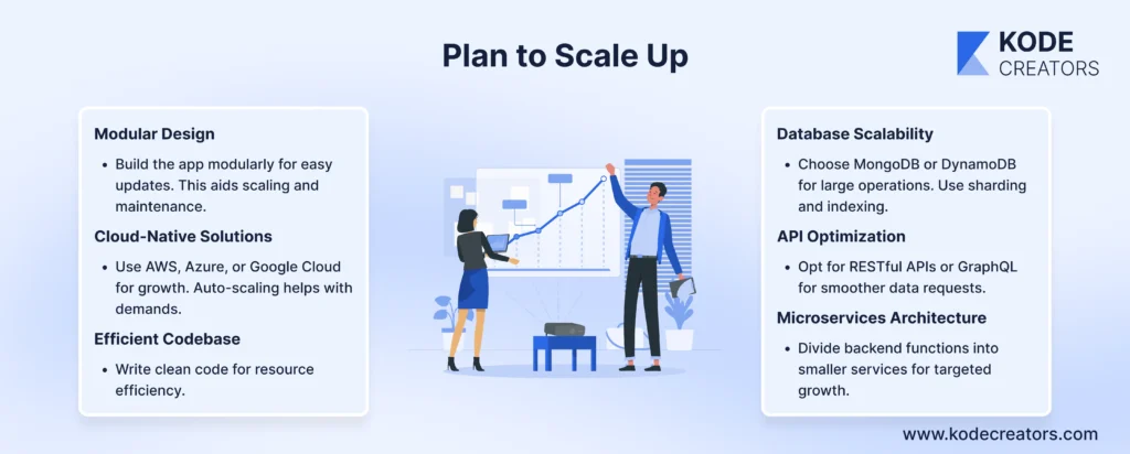 When you build a mobile app, you shouldn’t only consider the current market scenario, you also need to consider scalability. When an app is scalable, it will run smoothly as more users join and data grows, reducing the chance of software crashes or poor user experiences.