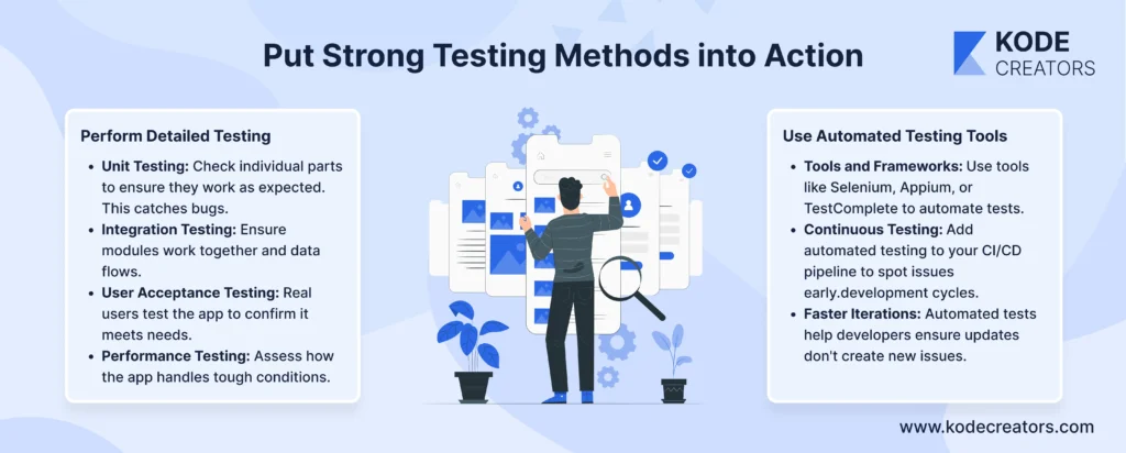 Testing plays a key role to make sure your app works under different circumstances. Well-organized and comprehensive testing methods help find bugs, boost performance, and make the user experience better before launch.