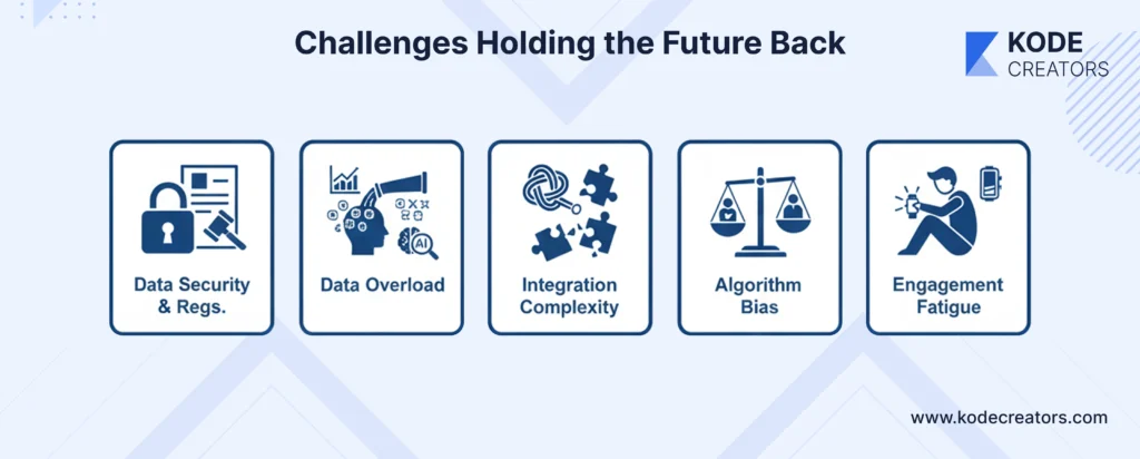 Data Security and Regulatory Bottlenecks create massive delays. FDA approval for medical-grade features takes years while hackers target health data worth 10x more than credit cards on black markets. Solution: sandbox regulatory environments and military-grade encryption from device to cloud.